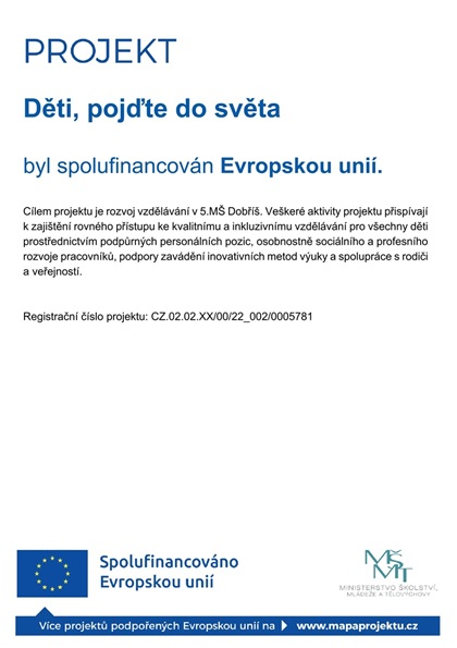 Reagovali jsme na projektovou výzvu č. 02-22-002 Šablony pro MŠ a ZŠ I Operačního programu Jan Amos Komenský s cílem dále zkvalitňovat činnost mateřské školy. S podporou a schválením města Dobříš jsme se zapojili do projektu a požádali MŠMT o poskytnutí finančních prostředků ve výši 770 591,- Kč na realizaci projektu Děti, pojďte do světa. Projekt je spolufinancován Evropskou unií. Cílem projektu je rozvoj vzdělávání v 5. mateřské škole Dobříš. Veškeré aktivity projektu přispívají k zajištění rovného přístupu ke kvalitnímu a inkluzivnímu vzdělávání pro všechny děti prostřednictvím podpůrných personálních pozic, osobnostně sociálního a profesního rozvoje pracovníků, podpory zavádění inovativních metod výuky a spolupráce s rodiči a veřejností. Naše projektová žádost splnila požadované formální i věcné požadavky. Aktuálně je ve fázi schvalování a čekáme na definitivní rozhodnutí MŠMT.