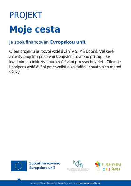 MŠMT předložený projekt „Moje cesta“ a jeho požadované finanční krytí schválilo pod registračním číslem CZ.02.02.XX/00/24_034/0016631. Doba trvání projektu je od 1.9. 2025 do 31.8. 2028. Získané finanční prostředky budou 5. mateřskou školou Dobříš využity v souladu s podanou žádostí a cílem projektu.